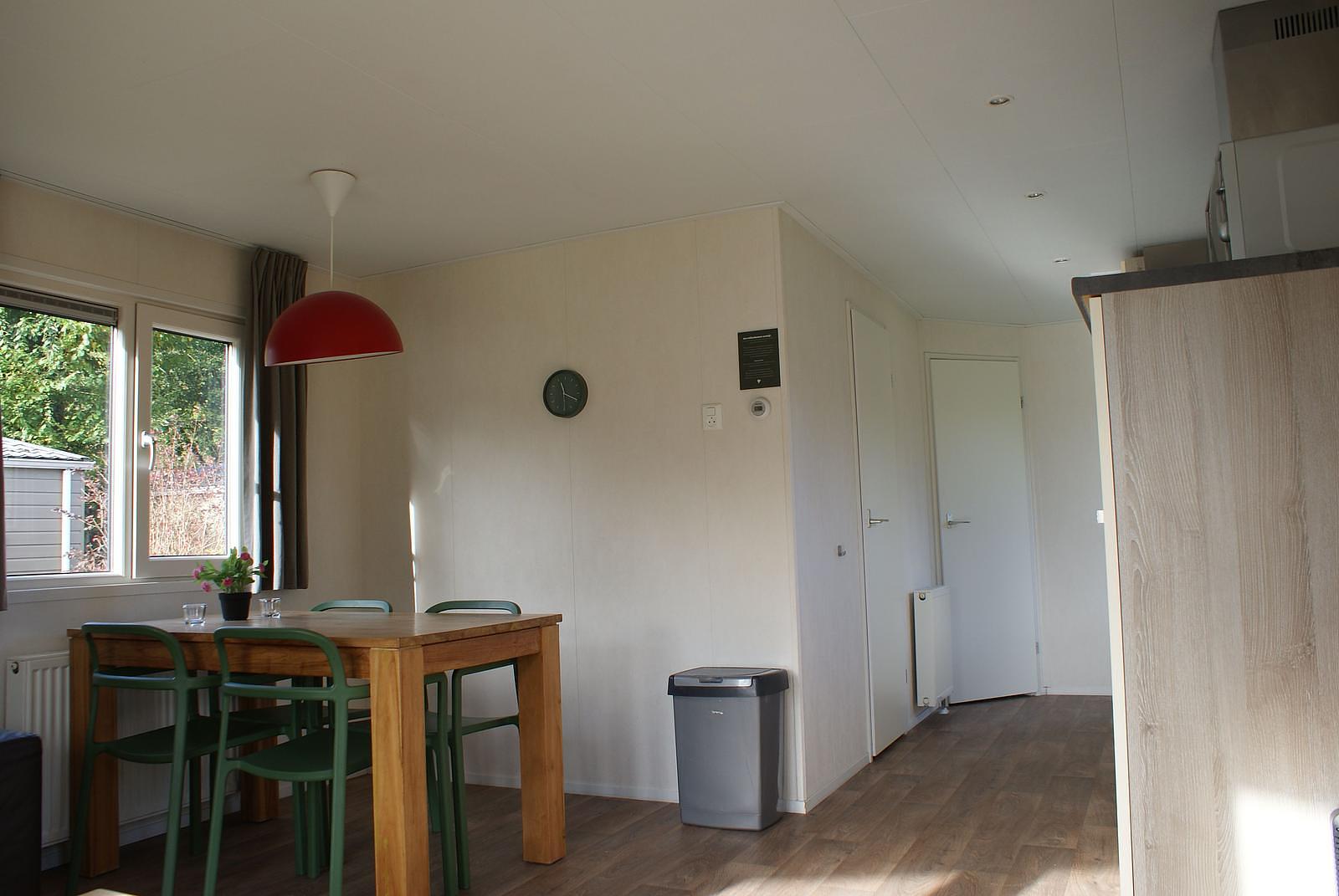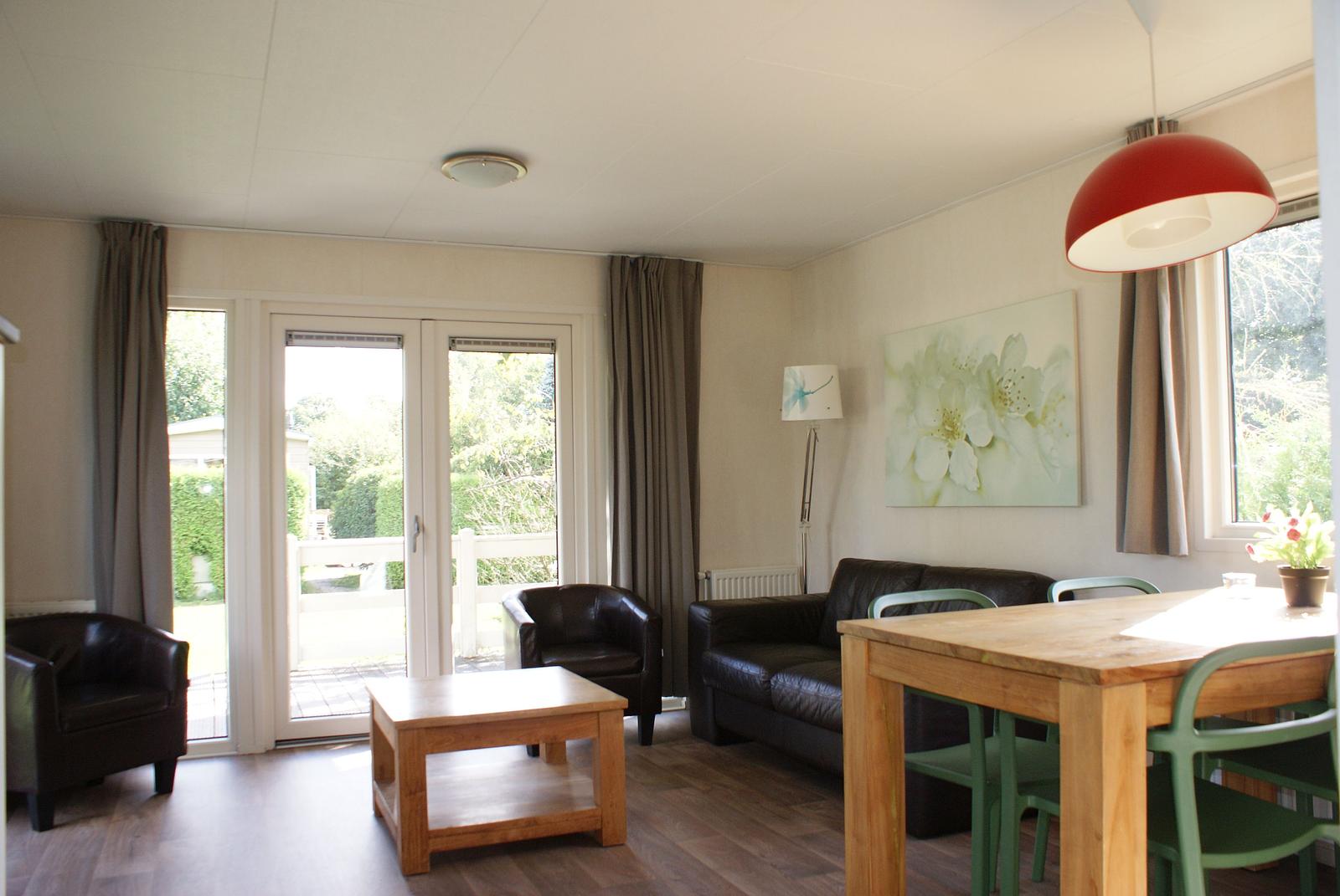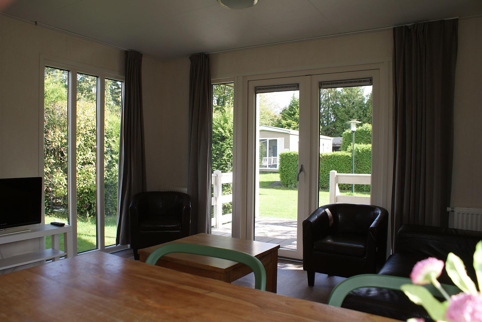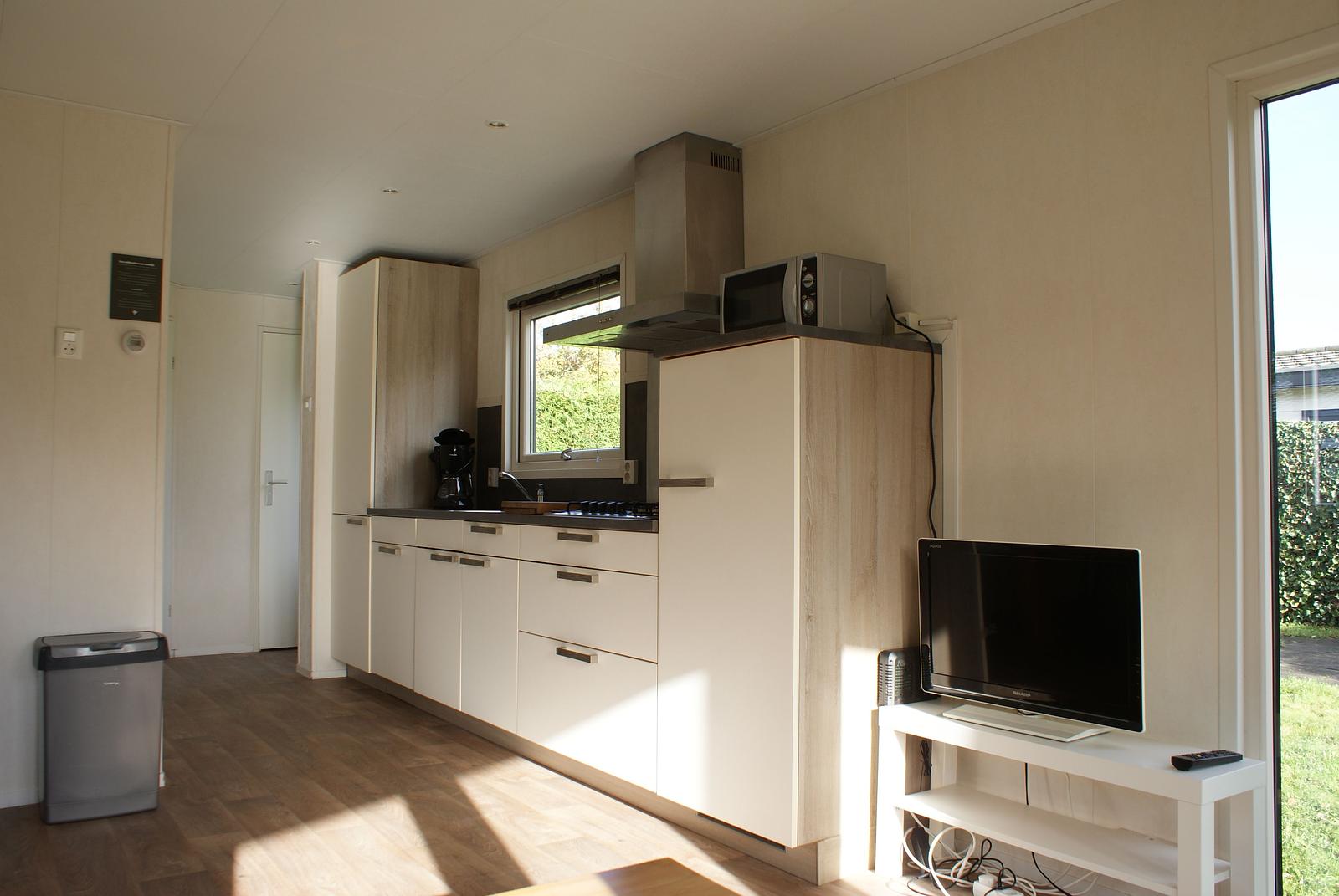 Entree. Ruime woonkamer met openslaande deuren en grote raampartijen voor extra lichtinval. Nette open keuken welke is voorzien van 5-pits gasstel, afzuigkap, vaatwasser, combimagnetron en koelkast met vriesvak. Er zijn 2 slaapkamers aanwezig, met in de ene een 2-persoonsbed en in de andere 2 1-persoonsbedden; totaal voldoende opbergruimte. De fraaie volledig betegelde badkamer heeft douche, wastafel, toilet en designradiator. Het chalet wordt verwarmd middels CV. Buiten heeft u de beschikking over een grote onderhoudsvriendelijke tuin met terras en BBQ. Berging.