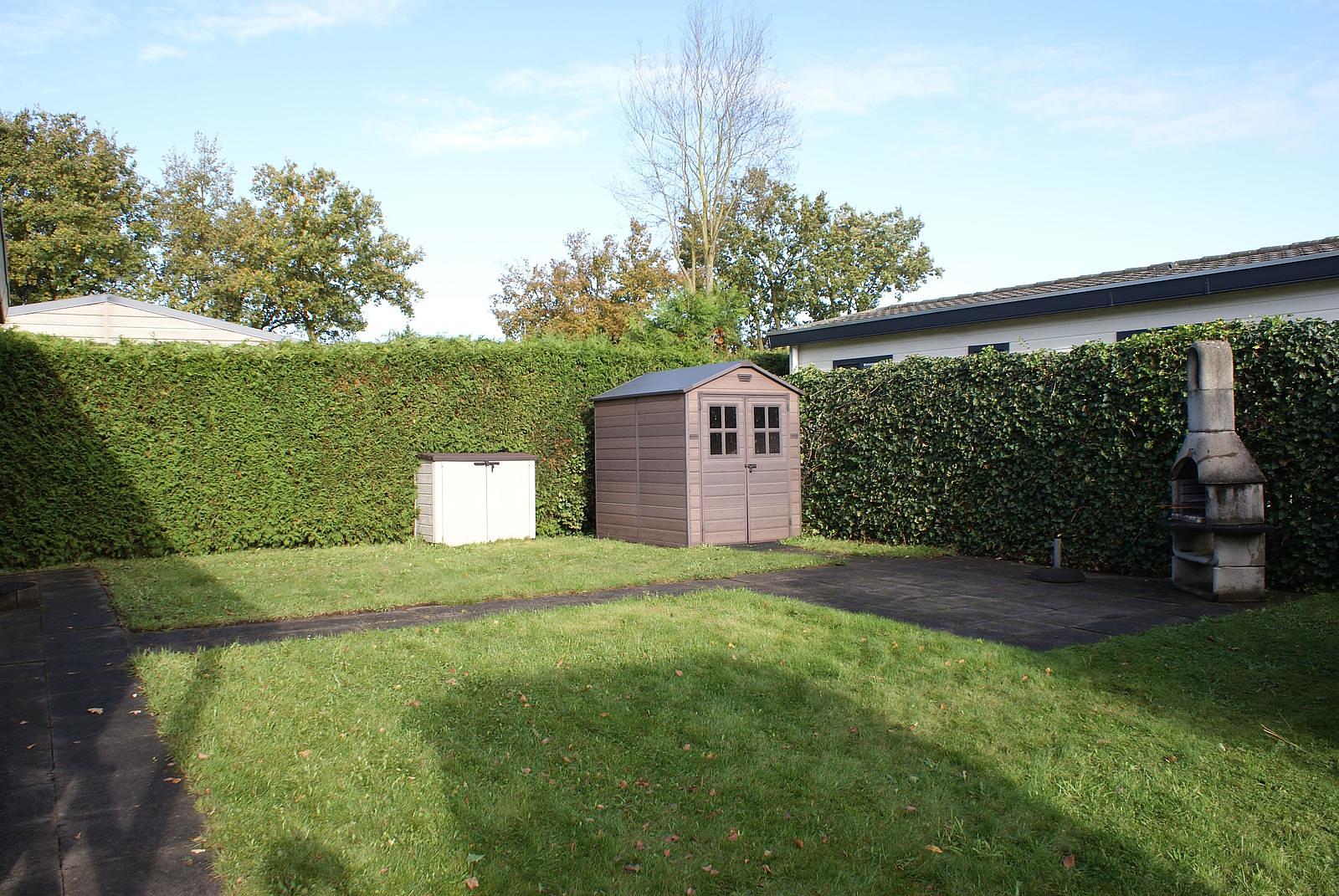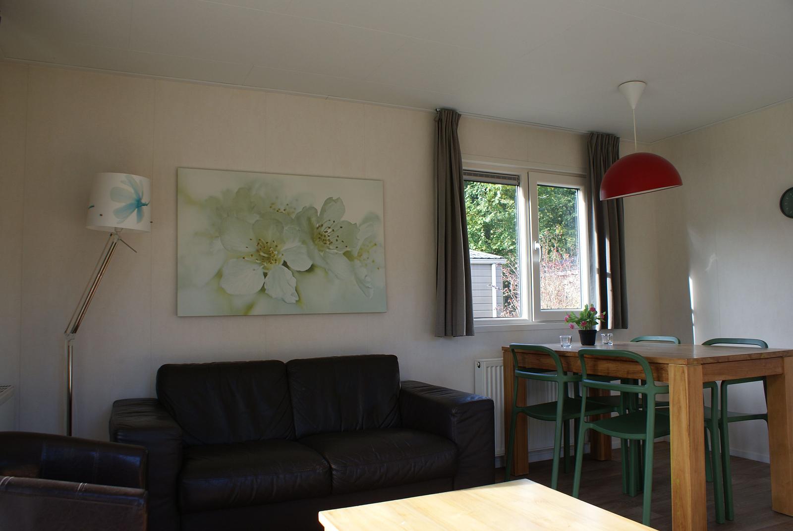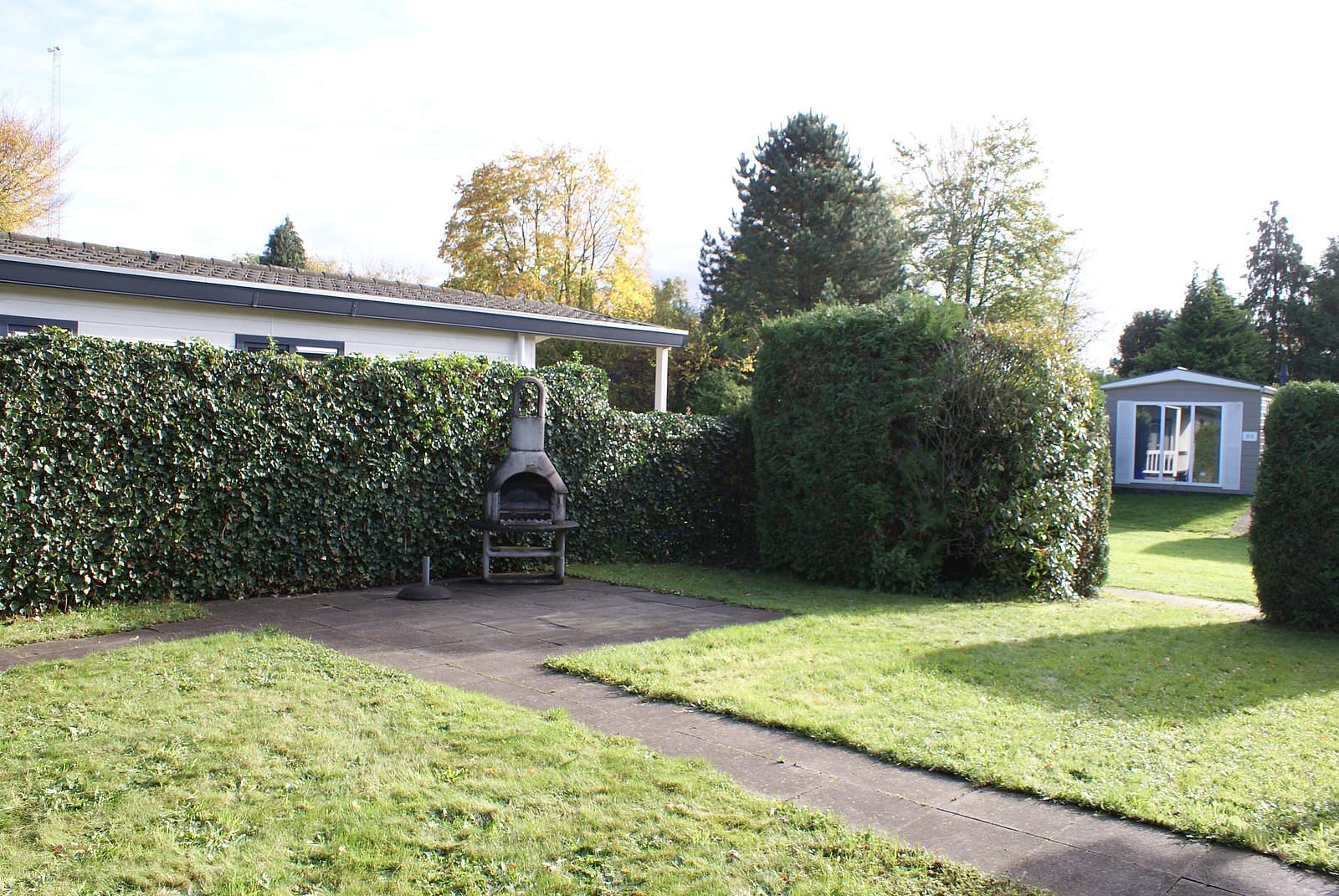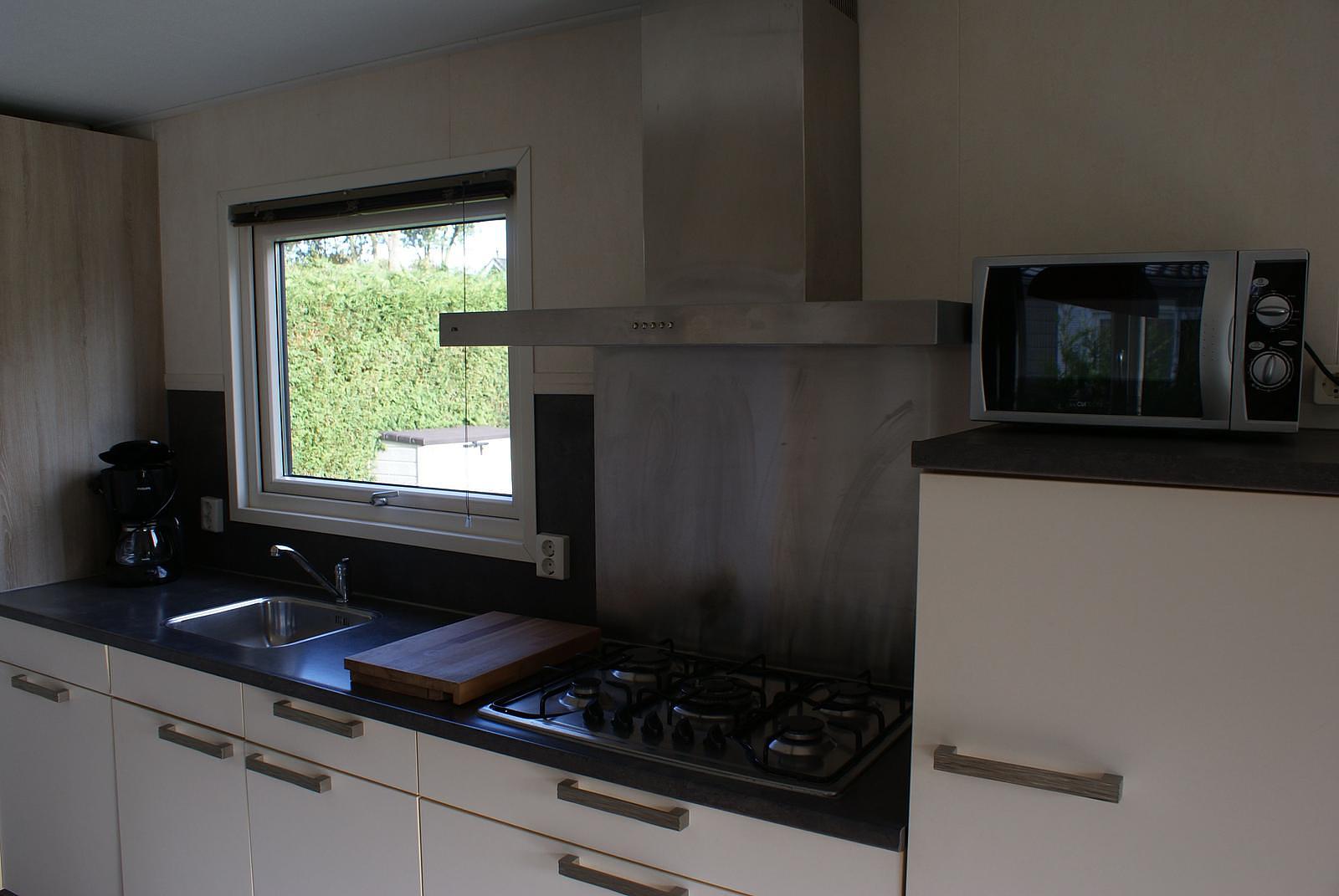 Entree. Ruime woonkamer met openslaande deuren en grote raampartijen voor extra lichtinval. Nette open keuken welke is voorzien van 5-pits gasstel, afzuigkap, vaatwasser, combimagnetron en koelkast met vriesvak. Er zijn 2 slaapkamers aanwezig, met in de ene een 2-persoonsbed en in de andere 2 1-persoonsbedden; totaal voldoende opbergruimte. De fraaie volledig betegelde badkamer heeft douche, wastafel, toilet en designradiator. Het chalet wordt verwarmd middels CV. Buiten heeft u de beschikking over een grote onderhoudsvriendelijke tuin met terras en BBQ. Berging.