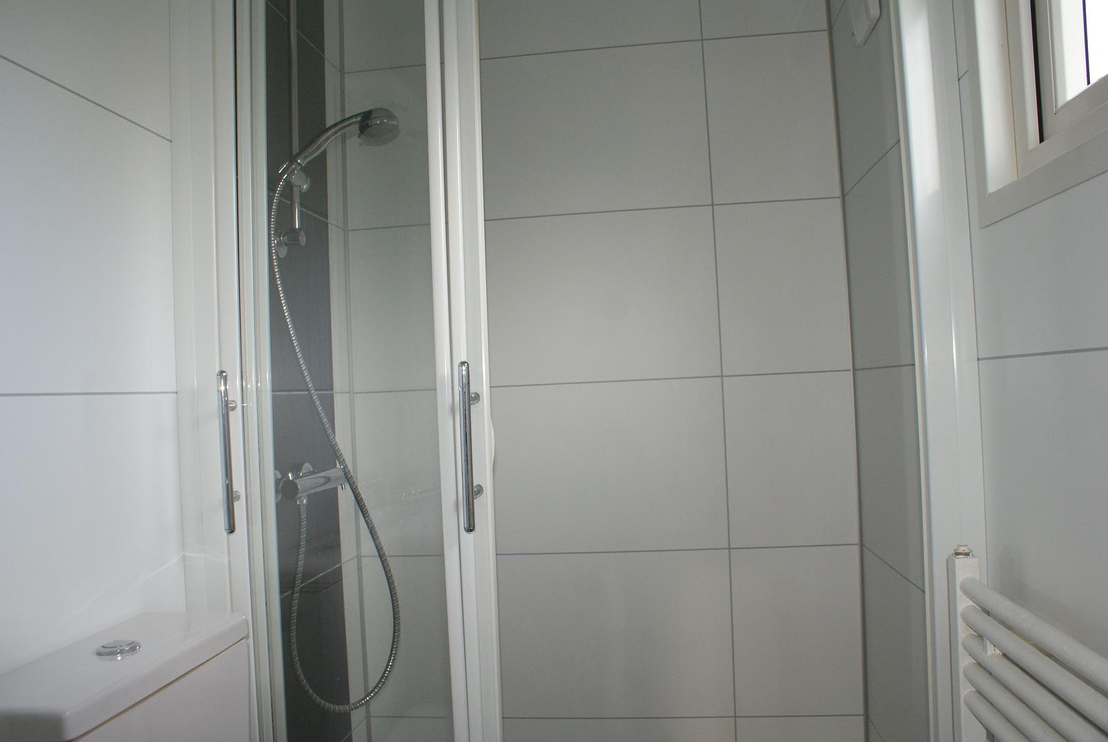 Fraaie volledig betegelde badkamer met douche, wastafel, toilet en designradiator.