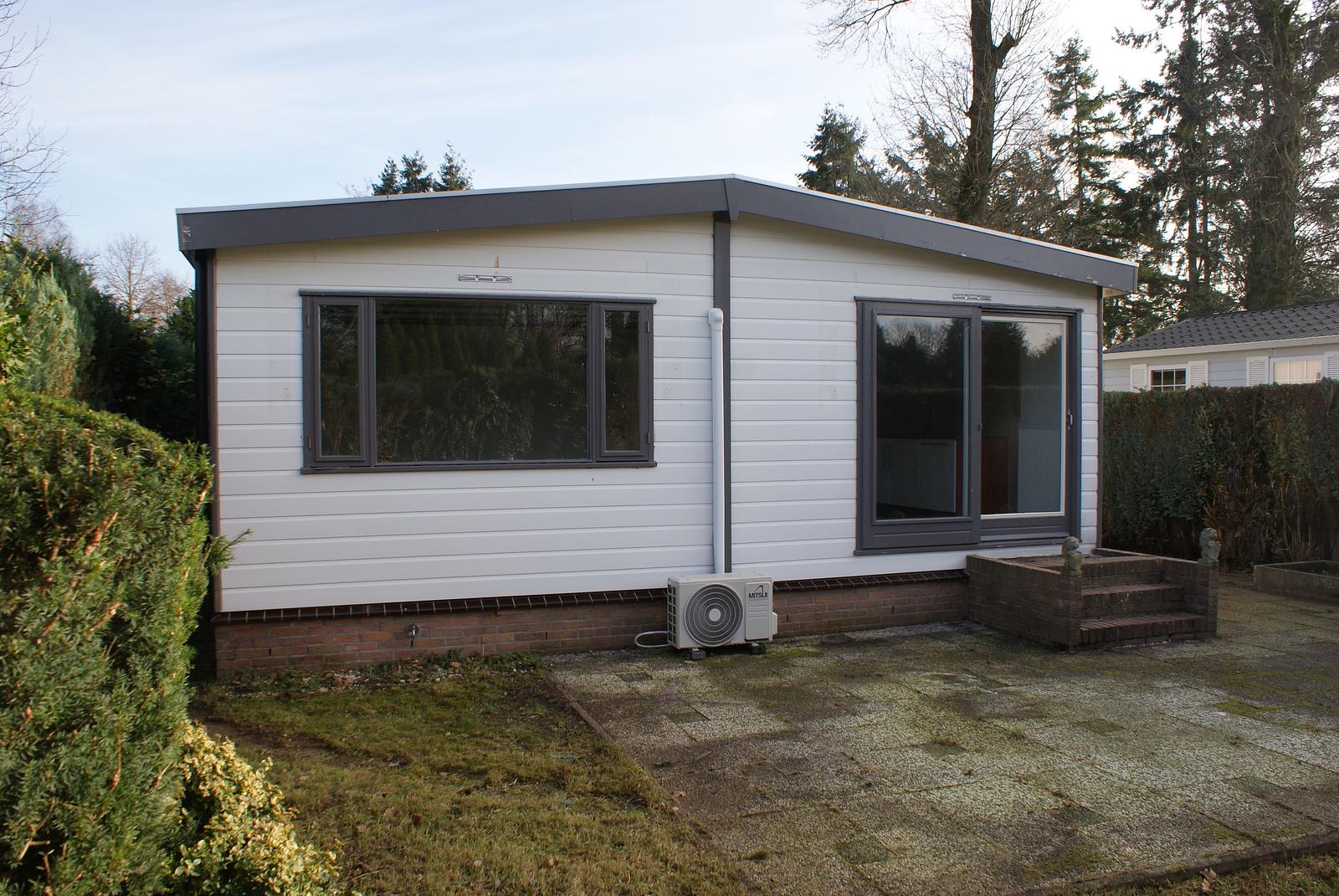 Basic vrijstaand chalet van ca. 50 m2 van PVC met houten kozijnen met de potentie een pareltje te worden. Gelegen op een beschutte kavel eigen grond van ca. 250 m2 met veel privacy vlakbij de centrale voorzieningen.
