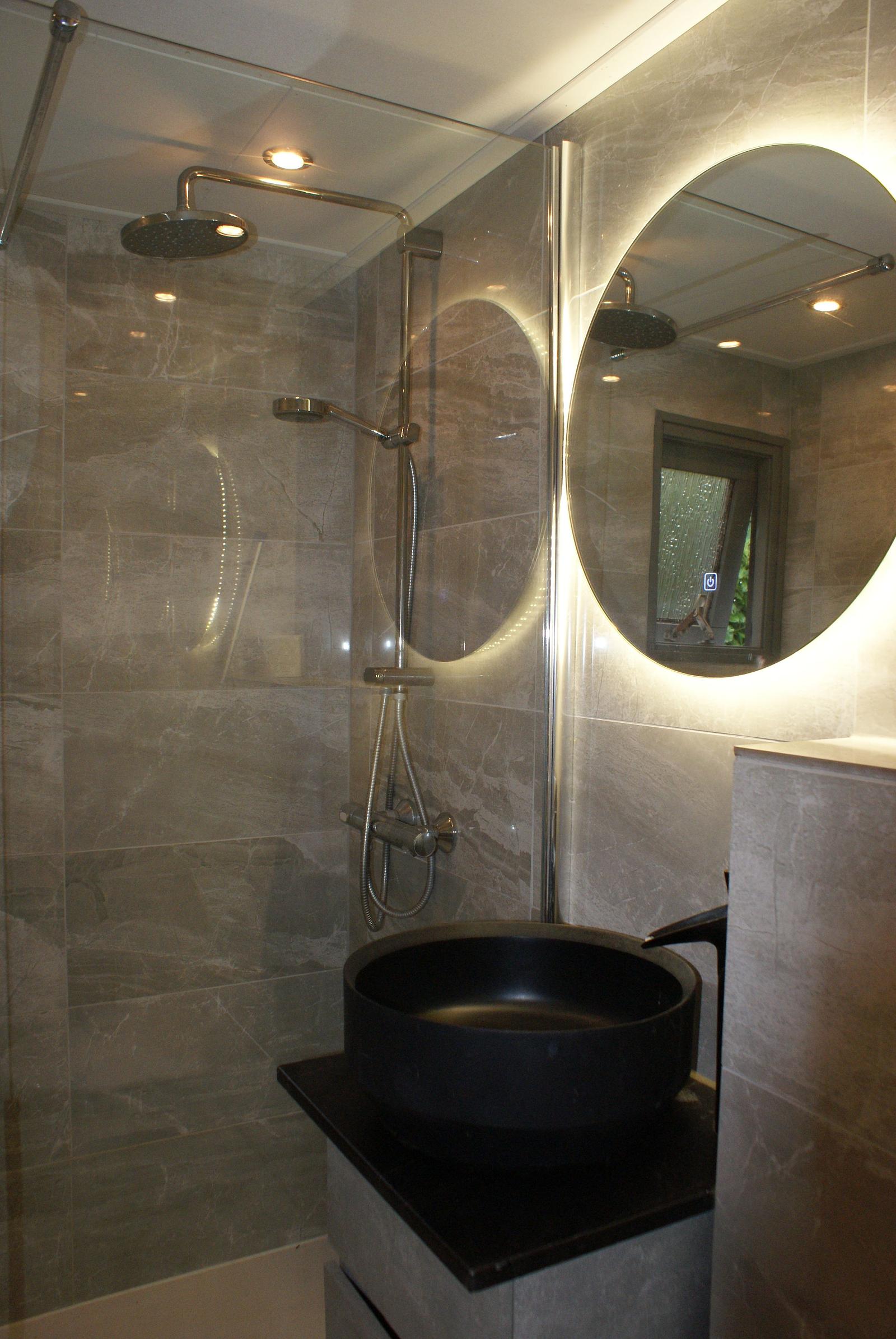 Moderne volledig betegelde badkamer met douche, wastafel en toilet (2025)