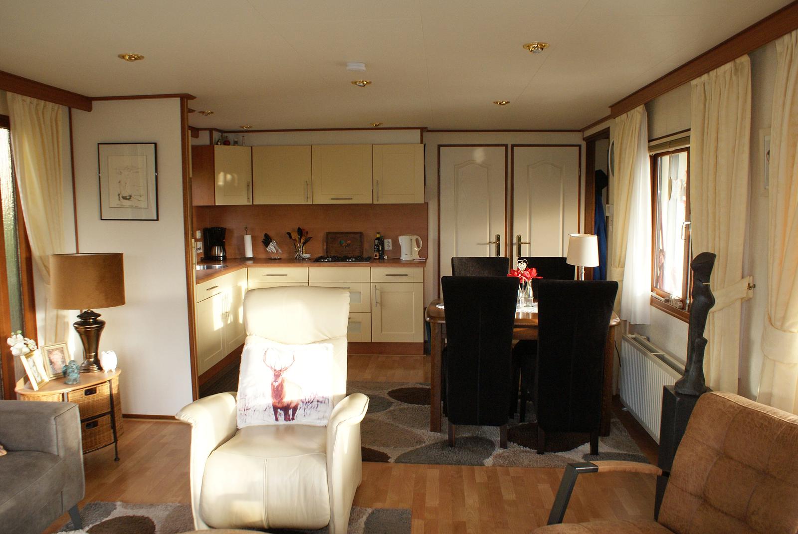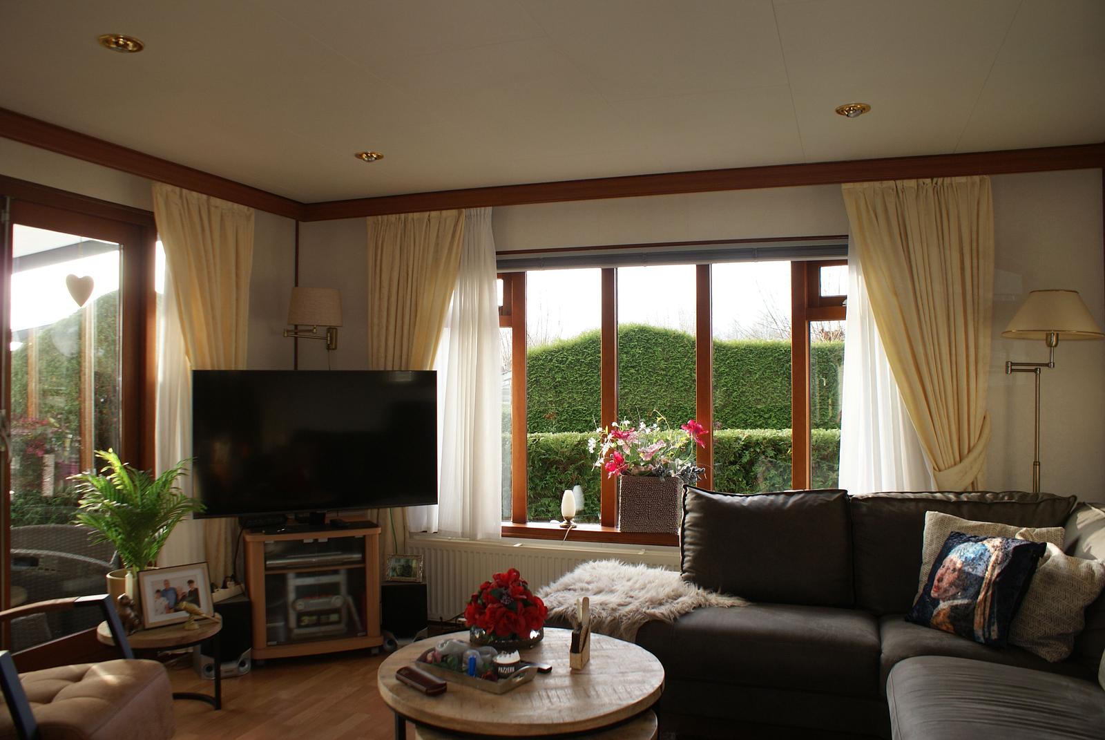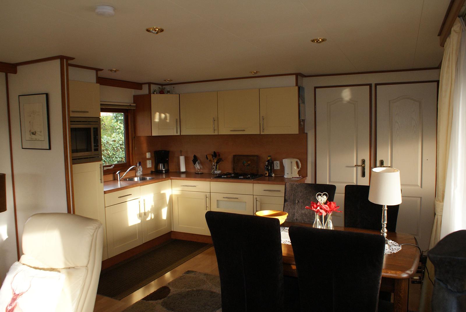 Entree via hal. Ruime gezellige woonkamer voorzien van een erker en openslaande deuren voor extra lichtinval. De woonkamer is tevens voorzien van airco. Fraaie open keuken welke is voorzien van een 4-pits gasstel, afzuigkap, ingebouwde combimagnetron, koelkast en ruim aanrechtblad voor volop werkruimte. Er zijn twee slaapkamers waarvan de ene is voorzien van 1 2-persoonsbed en kastenwand. De andere heeft 2 1-persoonsbedden en ook hier de beschikking over voldoende kastruimte. Volledig betegelde badkamer met douche, wasmeubel, designradiator en wasmachine. Separaat toilet. Het chalet wordt verwarmd middels CV (2017). Buiten beschikt u over een groot, verhoogd terras met overkapping om heerlijk buiten te zitten en lange avonden met familie of vrienden door te brengen. Tevens is er een blokhut aanwezig en beschikt u over een eigen ruime parkeerplaats.